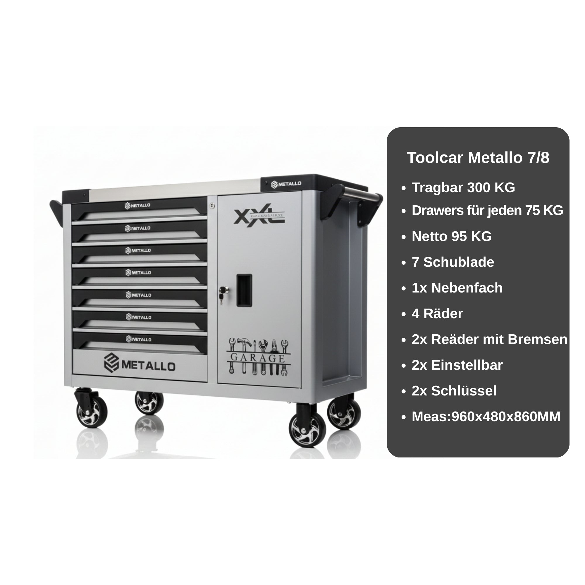 Der ToolCar Metallo ist die perfekte Lösung für professionelle Werkstätten und ambitionierte Heimwerker, die Wert auf höchste Funktionalität und Langlebigkeit legen. Mit seiner durchdachten Bauweise und robusten Verarbeitung ist dieser Werkstattwagen ein unverzichtbares Werkzeug für jede Arbeitsumgebung.