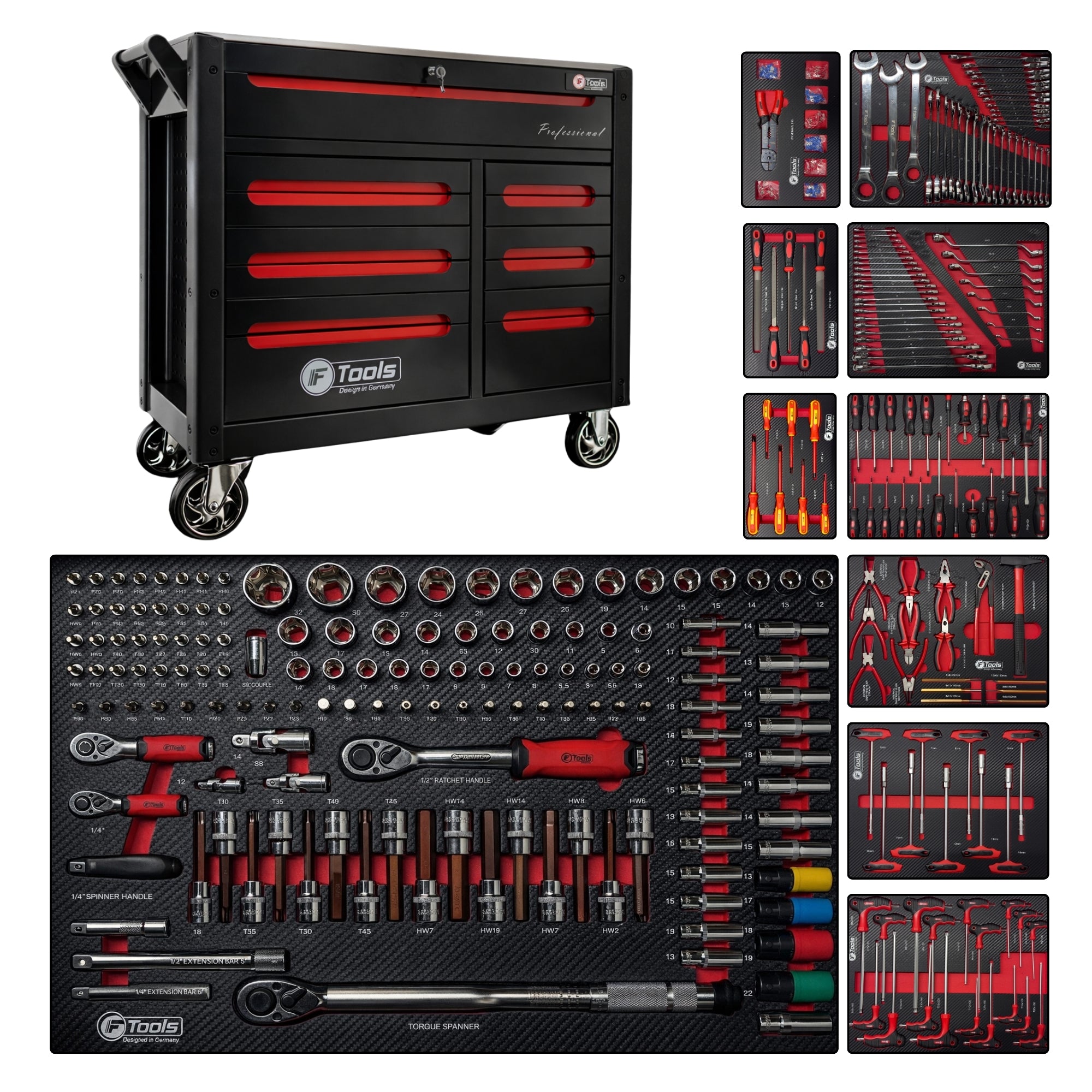 Der ToolCar F-Tools Werkstattwagen ist die perfekte Wahl für Werkstätten, Garagen oder Baustellen. Ob Sie professionell arbeiten oder ein ambitionierter Heimwerker sind, dieser Wagen hilft Ihnen, Ihre Werkzeuge organisiert und jederzeit griffbereit zu halten.