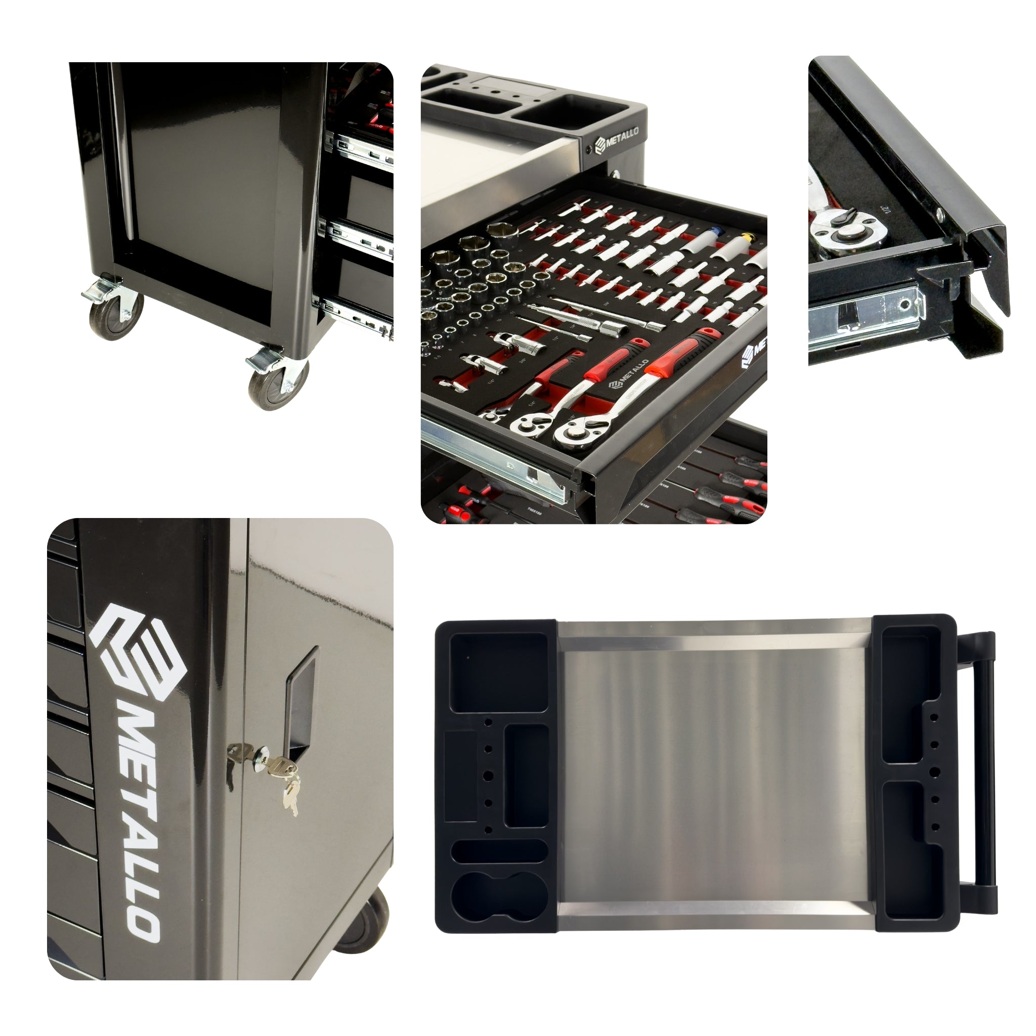 • Stauraum: Mit mehreren Schubladen bietet der Wagen Platz für eine Vielzahl von Werkzeugen und Zubehör, perfekt organisiert und jederzeit griffbereit.