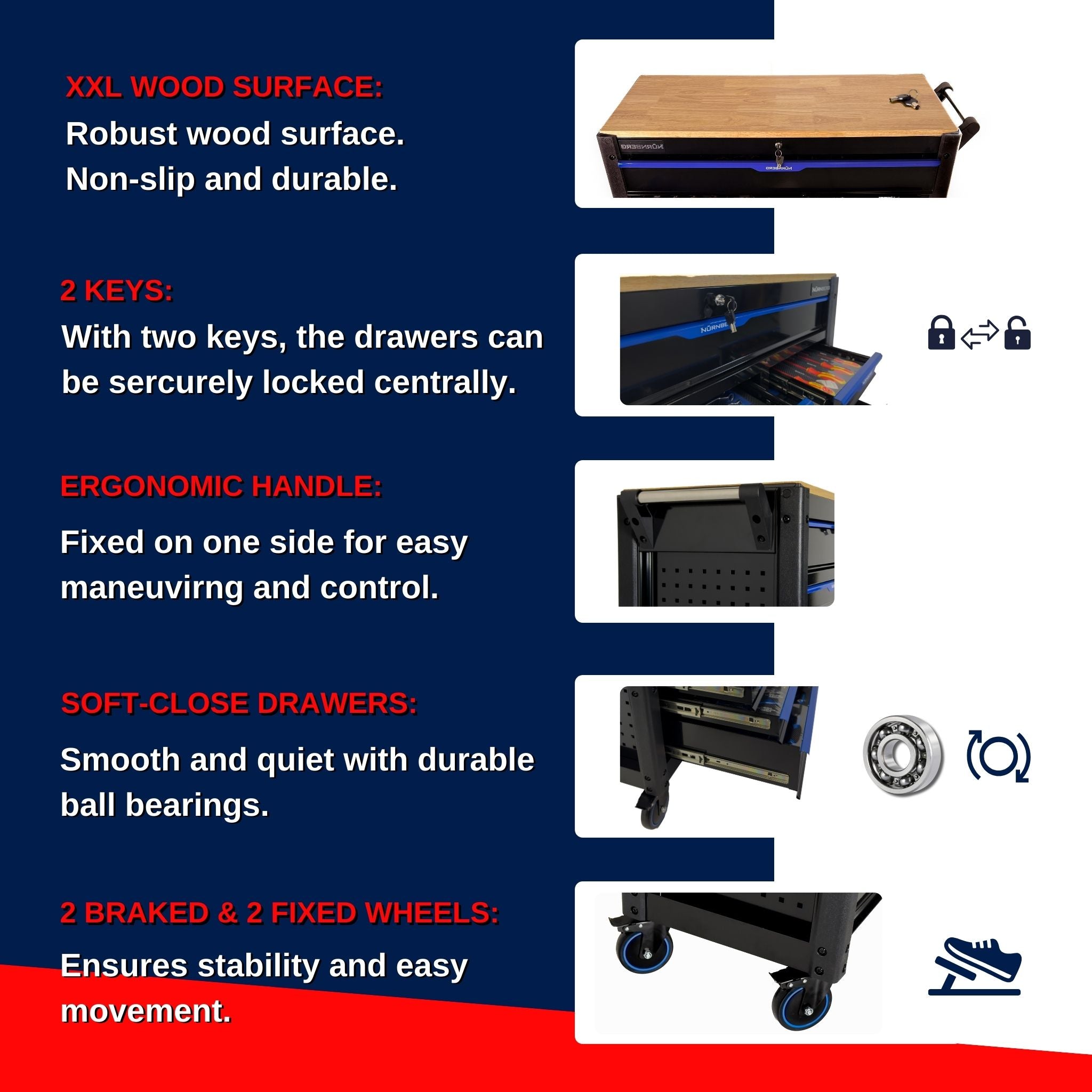 Das Modell Nürnberg ist der ideale Werkstattwagen für Profis und Heimwerker, die Wert auf Funktionalität, Mobilität und ein durchdachtes Design legen. Mit seiner modernen Konstruktion und hochwertigen Materialien bietet dieser Werkstattwagen eine langlebige und zuverlässige Lösung für die Organisation Ihrer Werkzeuge.